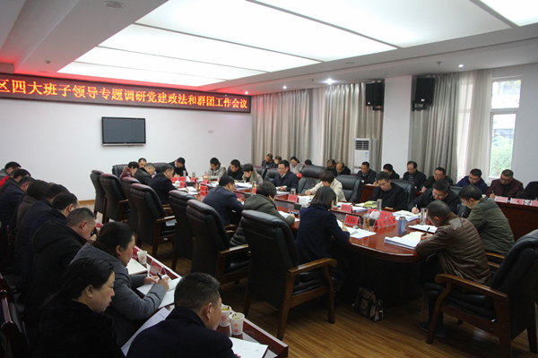 本网讯(黄凤来)1月12日下午,区四大班子领导专题调研党建政法和群团工作,全面总结2017年党建政法和群团工作,安排部署2018年工作。市委常委、区委书记蔡邦银出席会议并作重要讲话,区委副书记、区长伏玉琼,区人大常委会主任梁黎,区政协主席张晓春等四大班子领导出席会议。