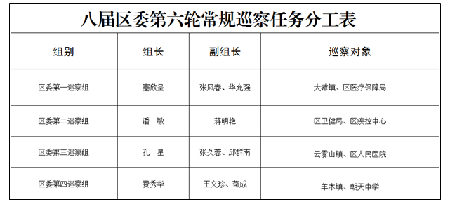 据悉,八届区委第六轮巡察从3月中旬启动,将派出4个巡察组分别对羊木镇、大滩镇、云雾山镇、区卫生健康局、区医疗保障局、朝天中学、区人民医院、区疾控中心等8个党组织开展常规巡察。