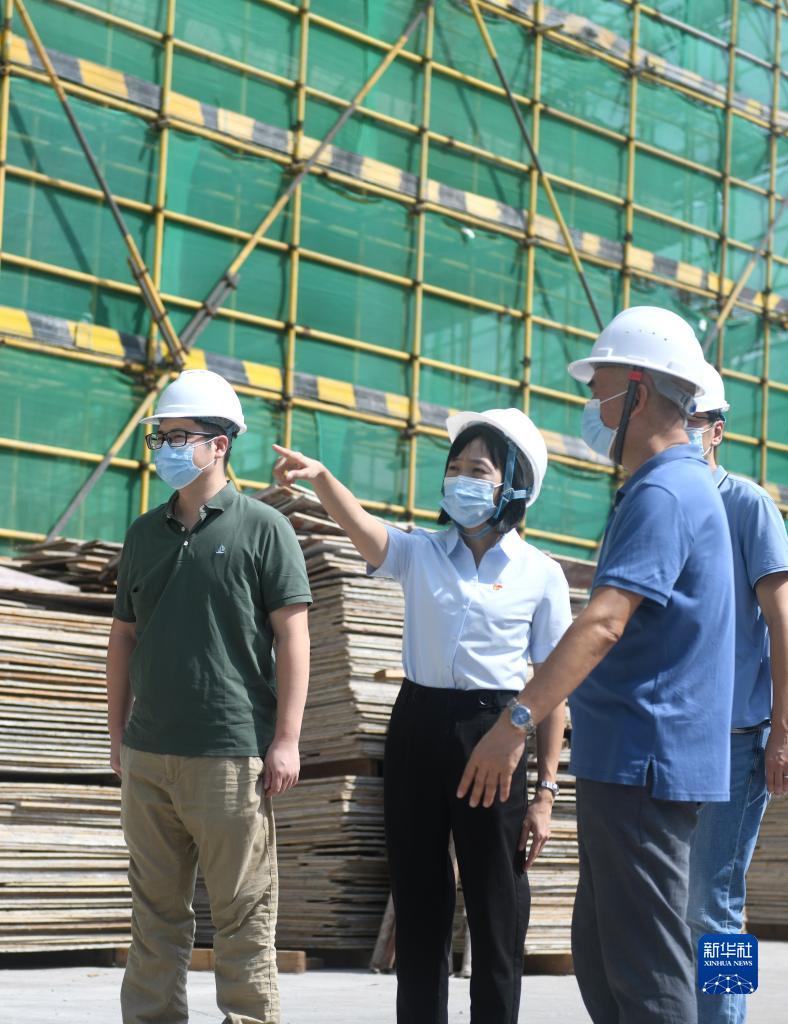 陆秀兴(左二)在佛山市禅城区张槎街道古灶村内一处产业园工地上与投资方交流(2022年9月7日摄)。新华社记者 卢汉欣 摄
