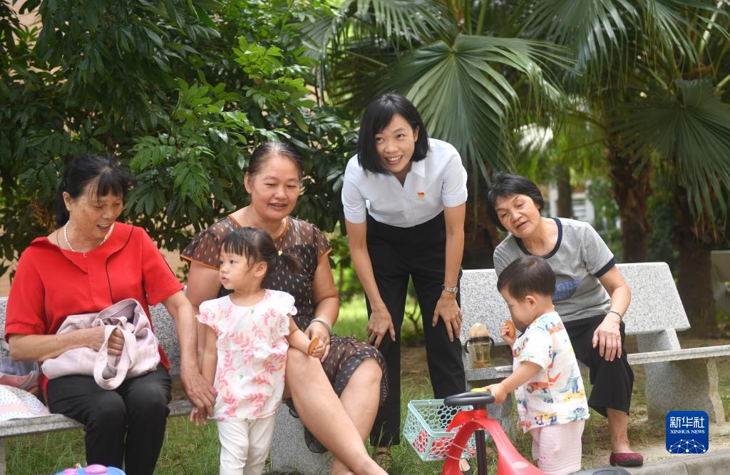 陆秀兴(右三)和佛山市禅城区张槎街道古灶村村民在一起聊天(2022年9月7日摄)。新华社记者 卢汉欣 摄