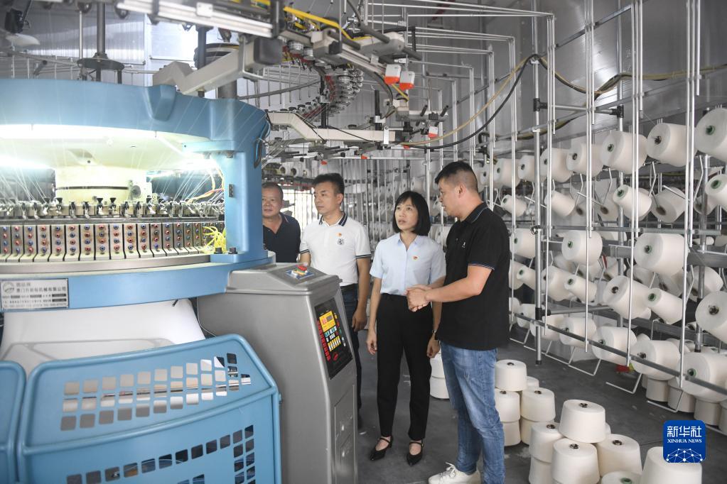 陆秀兴(右二)在佛山市禅城区张槎街道古灶村内一处产业园了解企业投资生产情况(2022年9月7日摄)。新华社记者 卢汉欣 摄