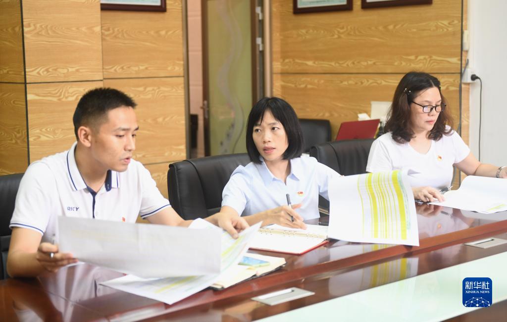 陆秀兴(中)与佛山市禅城区张槎街道古灶村“两委”班子同事开会交流(2022年9月7日摄)。新华社记者 卢汉欣 摄