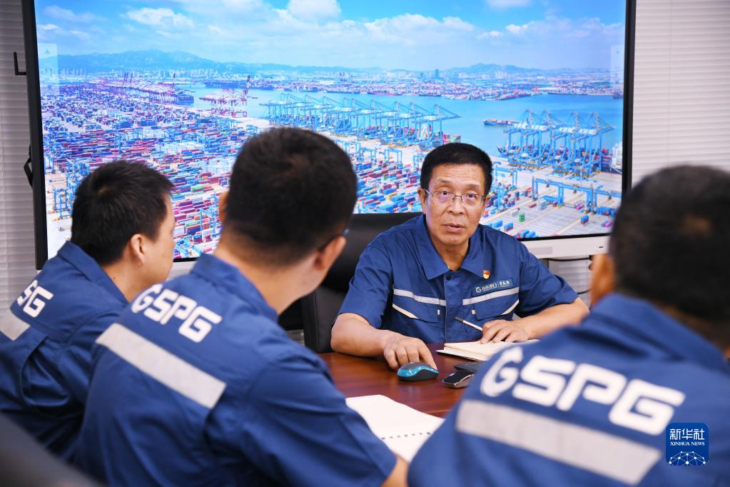 张连钢在青岛港与技术团队成员讨论(9月15日摄)。新华社记者 李紫恒 摄