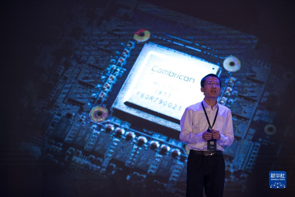 在上海国际会议中心举行的发布会上,寒武纪科技公司首席执行官陈天石介绍国内首款云端人工智能芯片(2018年5月3日摄)。新华社记者 金立旺 摄