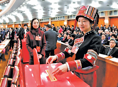 2018年3月,十三届全国人大一次会议通过宪法修正案草案,把习近平新时代中国特色社会主义思想载入国家根本法,在总纲中明确规定中国共产党领导是中国特色社会主义最本质的特征。图为2018年3月11日,十三届全国人大一次会议第三次全体会议上,代表投票表决宪法修正案草案。