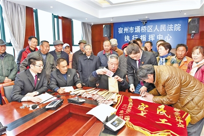健全完善综合治理“执行难”工作大格局,依法保障胜诉当事人及时实现权益。图为2019年3月,安徽省宿州市埇桥区人民法院为农民工发放被企业拖欠的工资。