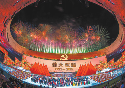 坚持把社会效益放在首位、社会效益和经济效益相统一,推进文化事业、文化产业和旅游业全面发展,努力为人民群众提供优秀文艺作品、优质文化产品和旅游产品。图为2021年6月28日晚,庆祝中国共产党成立100周年文艺演出——大型情景史诗《伟大征程》在国家体育场举行。