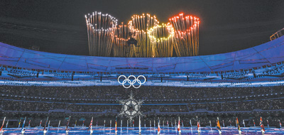 发展以人民为中心的体育,提高人民群众身体素质和生活品质,提高中国竞技体育综合实力和国际竞争力,成功举办北京冬奥会、冬残奥会。图为2022年2月20日北京冬奥会闭幕式焰火表演。