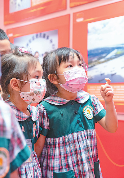 2021年6月至7月,澳门特别行政区举办“中国共产党的100年”大型主题图片展。图为澳门少年儿童在现场参观。