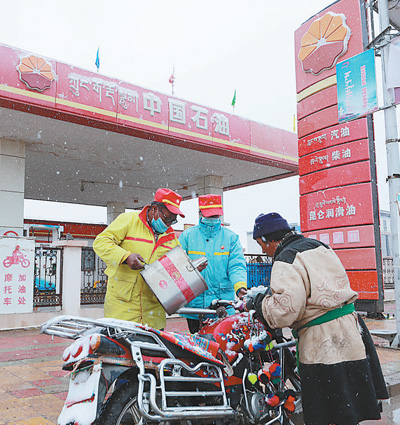 西藏自治区双湖县,世界海拔最高的加油站双湖加油站的摩托车加油处,员工冒雪为牧民的摩托车加油。