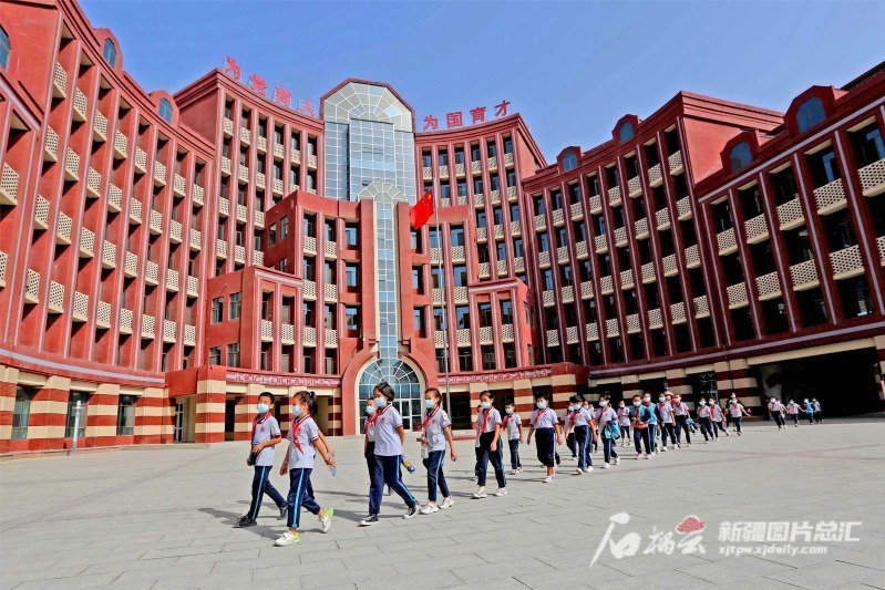 学生从哈密市豫哈实验学校教学楼走出(2021年9月28日摄)。该校2019年投入使用,占地面积约133亩。石榴云/新疆日报记者 蔡增乐摄(资料图)