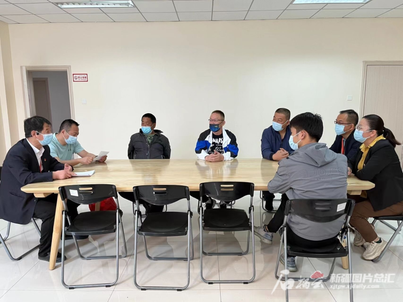 5月10日,赵天仓(左一)在克拉玛依市克拉玛依区银河路街道办事处佳福社区调解劳资纠纷。 穆园梅摄