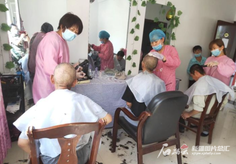 吉木萨尔县社会福利管理中心工作人员为老人理发。通讯员 张薇摄