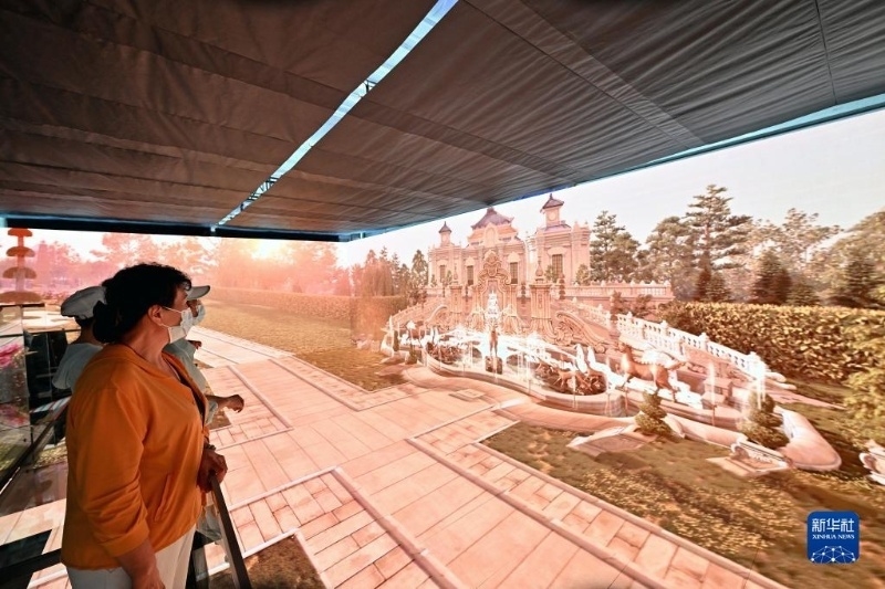 参观者在2022年中国国际服务贸易交易会文旅服务专题展良业夜游展台的《千机圆明》沉浸体验空间内欣赏数字技术模拟的圆明园景象(2022年9月5日摄)。新华社记者 李鑫 摄
