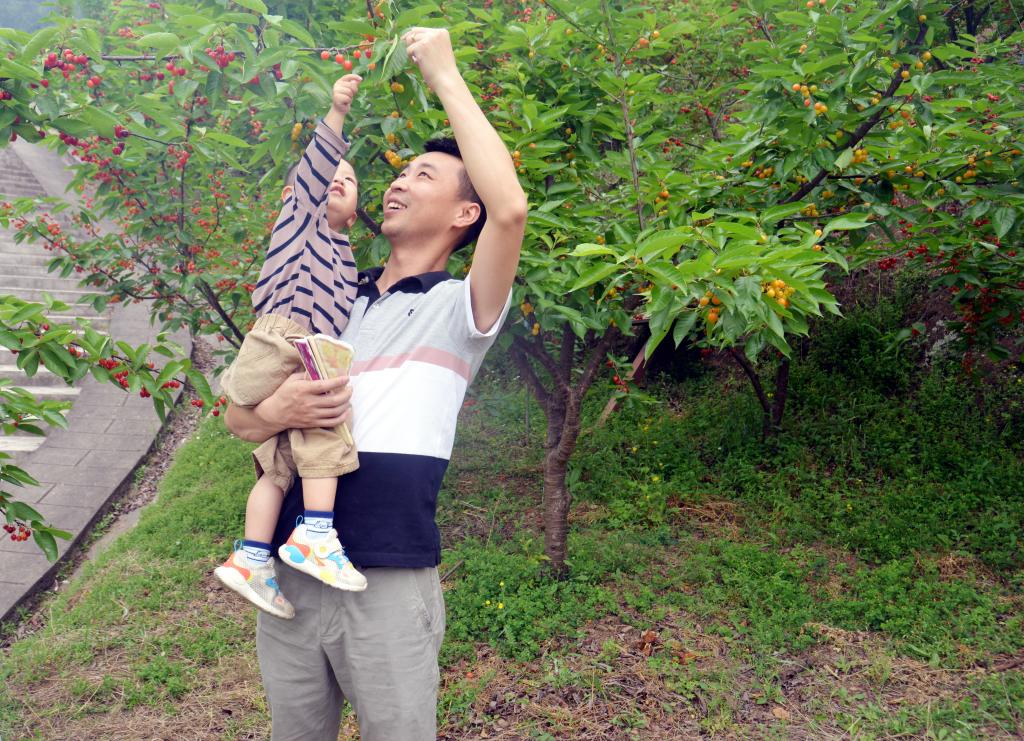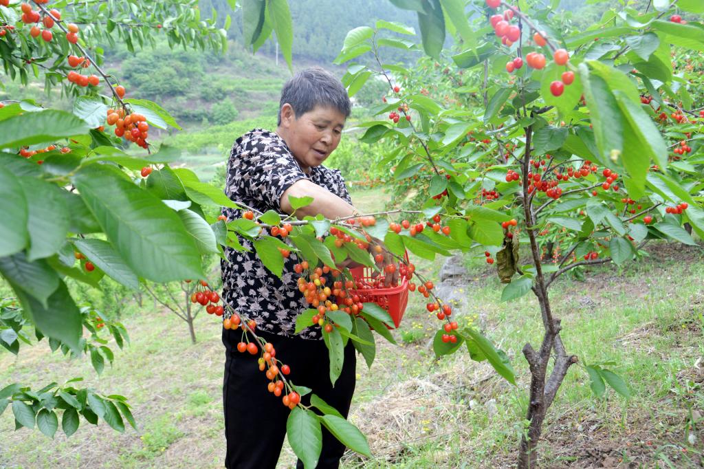 “恰恰举头千万颗,婆娑拂面两三株。”樱桃园内,娇艳欲滴的红樱桃掩映在翠绿的枝叶间,一蓬蓬、一簇簇,如珍珠、似玛瑙,晶莹剔透,惹人垂涎。“我们家的樱桃甘甜多汁,口感好,每年过来采摘的客人都说好吃。”樱桃树下,刘文林一边指引游客们采摘鲜美的樱桃,一边笑着介绍。