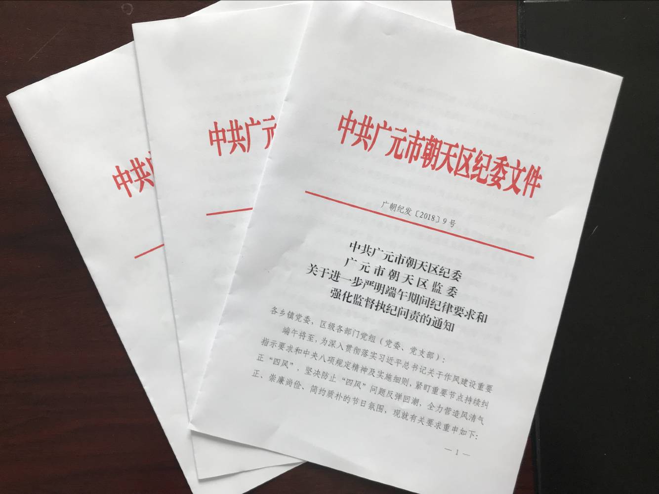 端午将至,朝天区纪委监委印发《关于进一步严明端午期间纪律要求和强化监督执纪问责的通知》,及时向党员干部发信号、打招呼、提要求,要求全区广大党员干部以身作则,以上率下,严格遵守纪律规定,带头抵制“四风”,积极营造崇廉尚俭的节日氛围。