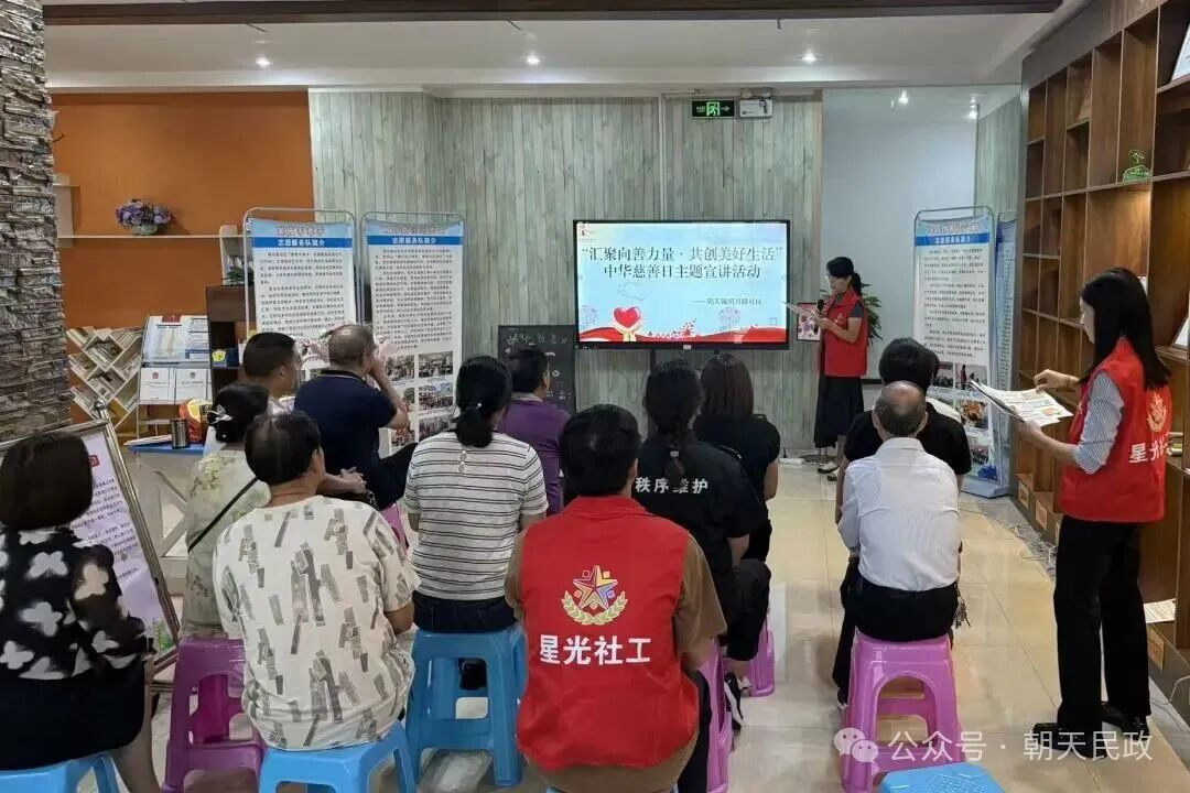 近期,为弘扬慈善文化、激发社区居民参与公益慈善的热情。区民政局、区慈善会联合朝天区星光社会工作服务中心,在朝天镇明月路社区开展了以“汇聚向善力量 共创美好生活”为主题的中华慈善日活动。