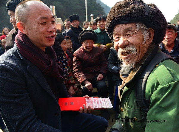 两河口村三组84岁的老人何兰英这是连续第四年领到1600元的敬老基金了,说起芮明光的好,她语声哽咽;“他把辛辛苦苦挣的钱给我们老人,年年都给我们,我心里感激的很啦,惟愿他一辈子过得好,挣钱多,儿子儿孙都好哇。”
