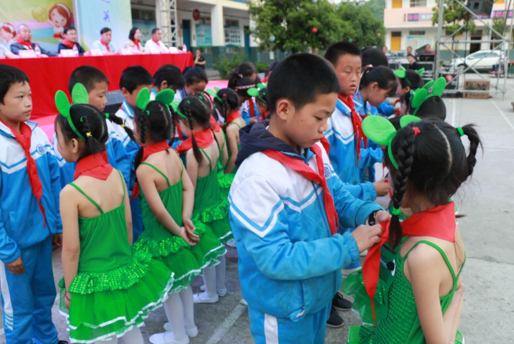 新少先队员入队仪式:老队员为新队员佩戴红领巾