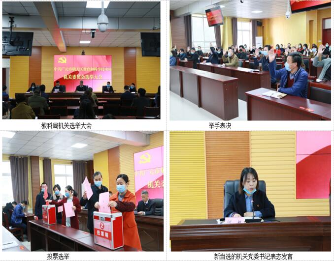 会议通过了《中共广元市朝天区教育和科学技术局机关委员会选举办法》和候选人、工作人员建议名单,并以无记名投票方式差额选举产生了机关党委委员、机关纪委委员。随后在新一届委员会第一次全会上,选举产生了机关党委书记、副书记、纪委书记,并明确了委员分工。机关党委书记代表两委班子做了表态发言。