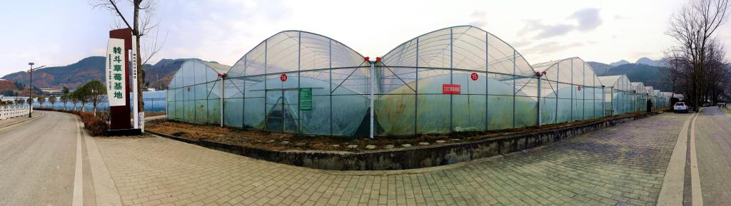 站在中子镇转斗草莓种植示范基地的休闲小广场上,举目望去,只见青山绿水间,300多个标准化草莓种植大棚整齐排列开来,蔚为壮观。
