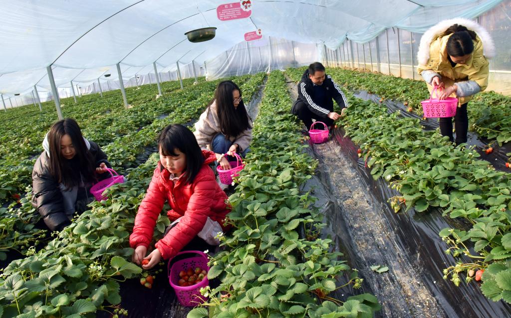 “像靳维学这样在基地务工年收入超过5万元的,至少有十多户,其余的年户均收入也基本在2—3万元。”全程参与基地建设、管理的校场村党支部书记严加华介绍,基地按1000元/亩/年在校场村流转土地500亩,群众年收租金50万元;同时,基地优先吸纳100余名当地群众(贫困户)务工,群众年实现收入60余万元;此外,村集体经济还为贫困户提供公益性岗位24个,红火的草莓采摘项目带动周边群众发展农家乐10余家……草莓产业让校场村实现了跨越式发展。