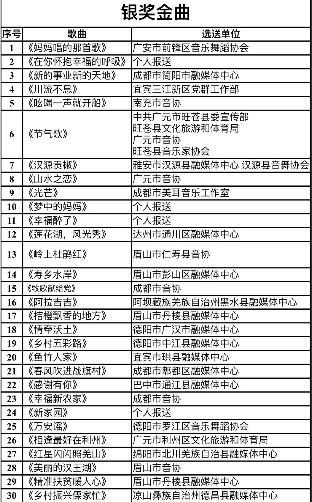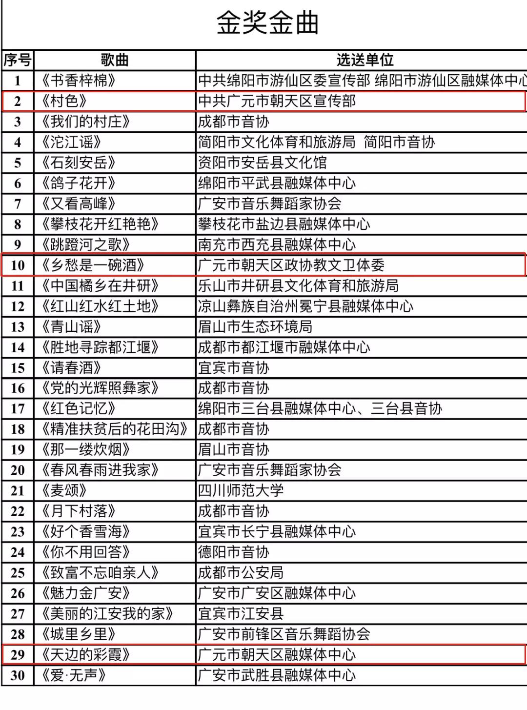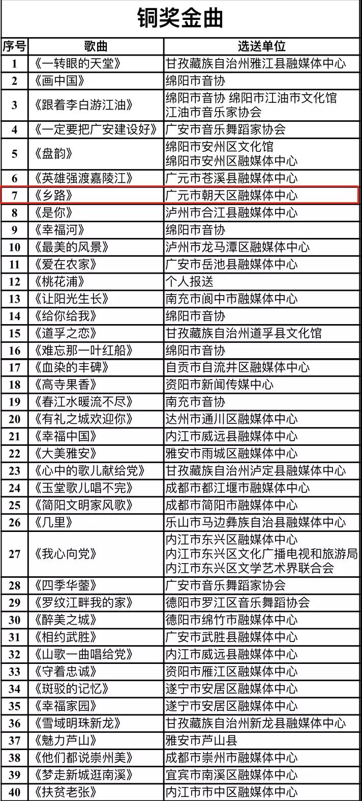 其中,朝天区选送的原创本土歌曲《村色》、《乡愁是一碗酒》、《天边的彩霞》荣获金奖金曲,《乡路》荣获铜奖金曲。