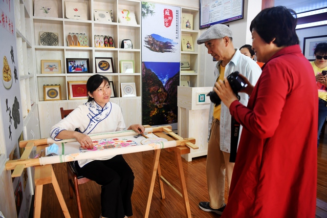 仲夏时节,正是曾家山的旅游旺季。“太好看了,我要买一个。”“老板,可以教我怎么绣不?”……在曾家镇汉王老街麻柳刺绣馆里,衣服、钱包、笔记本等精美的麻柳刺绣文创产品吸引了过往游客,大家纷纷选购,或是欣赏。很多来自外地的游客,更是留下联系方式,以便今后联系。
