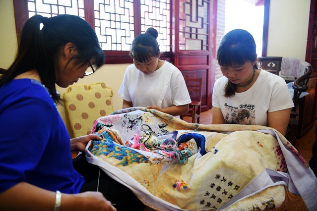 为了将麻柳刺绣传承下去,张菊花还和绣女们不断探究和创新,在继承传统工艺的基础上不断完善刺绣技艺。“艺术的道路虽然艰辛,但我从来没有想过放弃,希望把这门技艺传承下去。”从张菊花恬静的面容和温软的话语里,分明感受到这位农村妇女身上有一种植根于骨血的坚守。