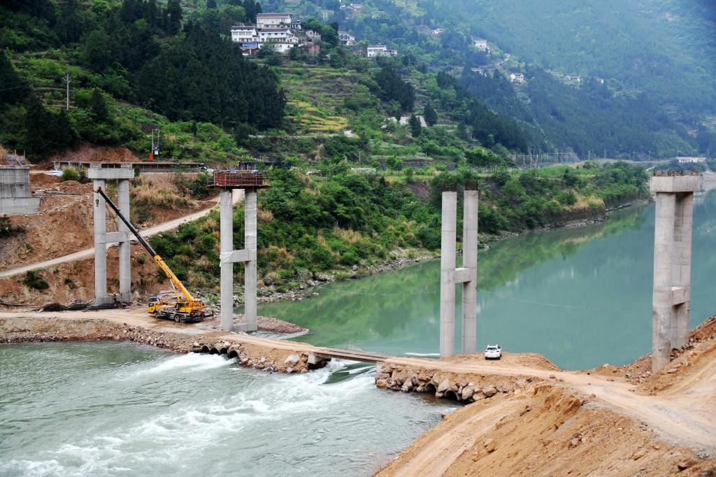 4月20日,从朝天城区沿嘉陵江北上到大滩镇火车站,一路上,俞家村铁索桥改公路桥、烟灯嘉陵江大桥、八庙沟嘉陵江大桥、九井湾嘉陵江大桥正在如火如荼的建设,一座座桥梁墩柱拔地而起,施工便桥穿江而过,工程车辆来回穿梭,现场繁忙有序。
