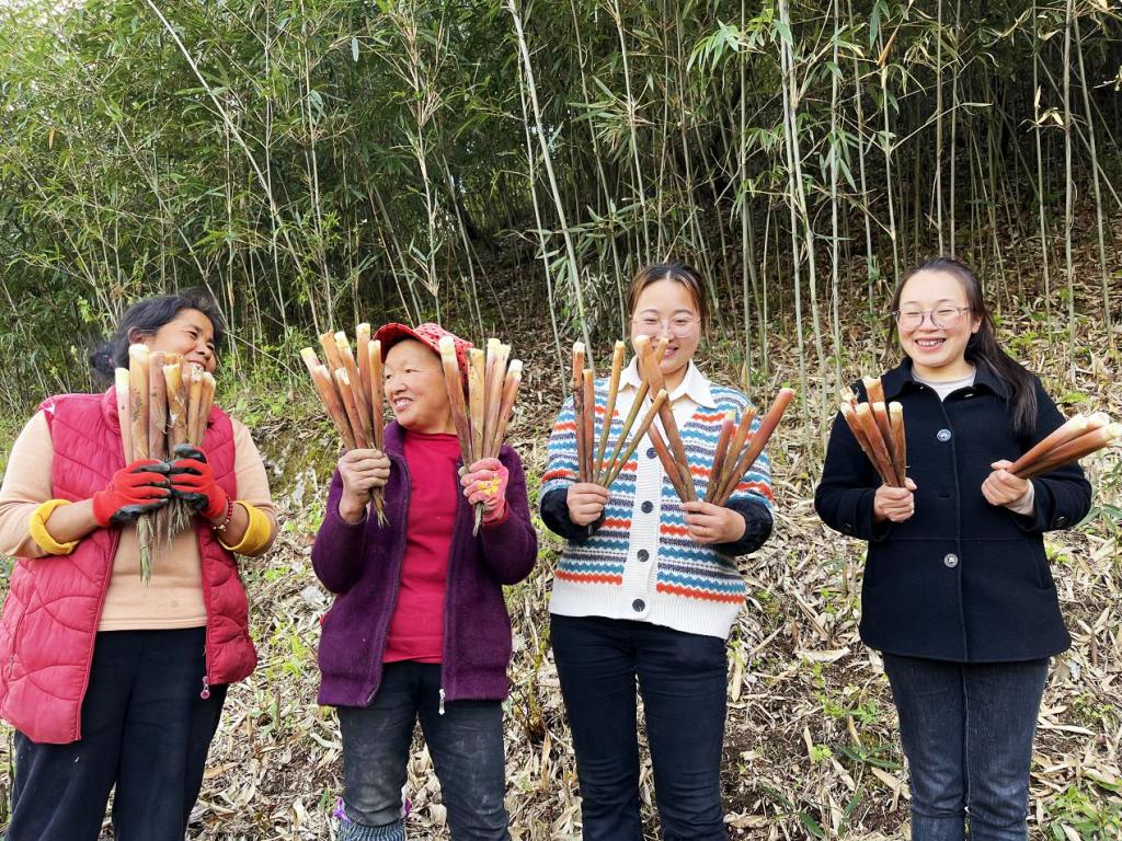 “今年春季雨水比较多,竹笋长得快,四月初开始,每天一早,我们都要上山扯笋子。卖完自己扯的笋子,我还到村上的竹产业基地打打零工,挣点工资。”大尖山村群众肖泽英戴着手套,麻利地采摘着竹笋,她高兴地说,笋用竹产业发展得越来越好,仅在基地做做零工,她一年就能收入一万多元。