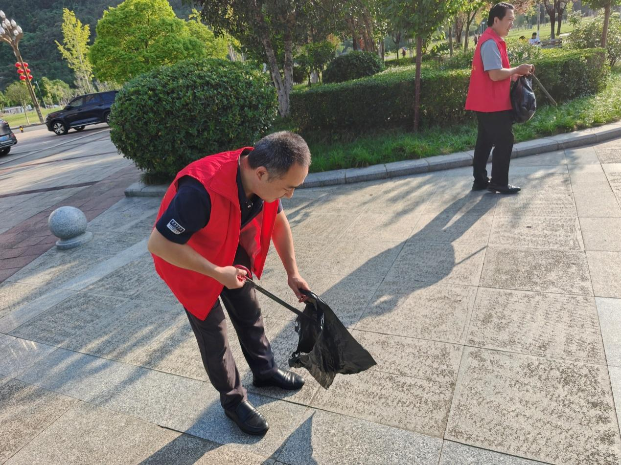 区政府办志愿者清扫公园地面垃圾