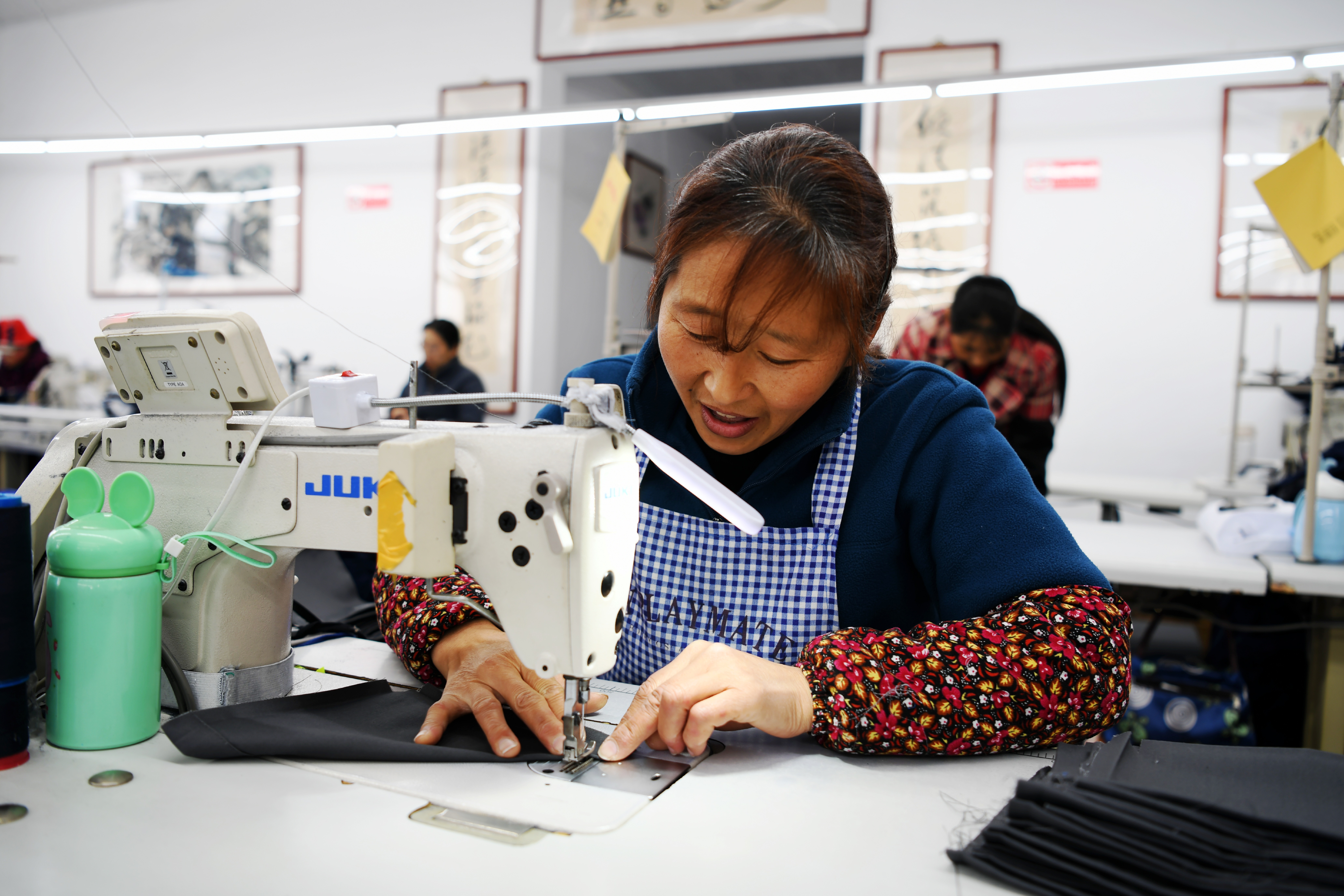 61岁的工人徐云珍正在给衣服缝制魔术贴,她说,自己种了4亩地,在家门口的“扶贫车间”上班不仅增加了收入,还可以兼顾做农活。她去年3月进厂,以前怀疑自己的基础不能胜任,后来经过培训和指导,渐渐变得熟练,现在感觉在这里上班很幸福。“尤其是听说我们这个小山村生产的产品还可以卖到国外,非常自豪。”
