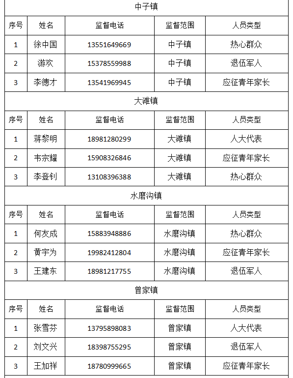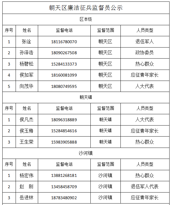 为做好廉洁征兵工作,推进阳光征兵,确保为部队输送优质兵员,根据国防部征兵办公室关于建立廉洁征兵“零报告”制度和廉洁征兵监督员制度等有关规定,现将相关廉洁征兵监督员信息予以公示。