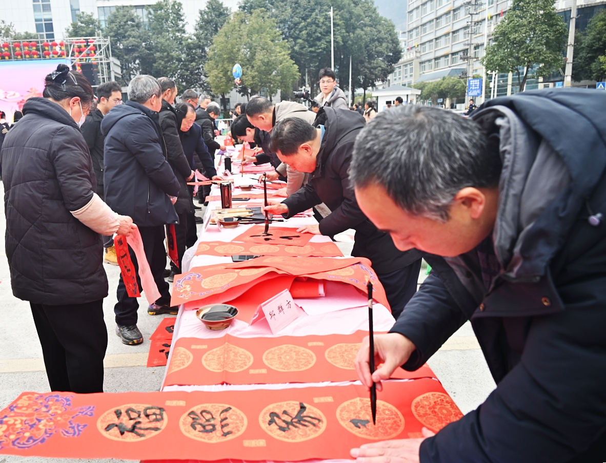 在一旁的互动体验区,书法爱好者们挥毫泼墨,将写满新年祝福的喜庆春联和“福”字送给围观的市民。行书、楷书、隶书各显神韵,横竖撇捺饱含希冀,将新年的美好祝愿融入字里行间。市民们手捧着散发着墨香的春联,心中充满了对新一年美好生活的期许。