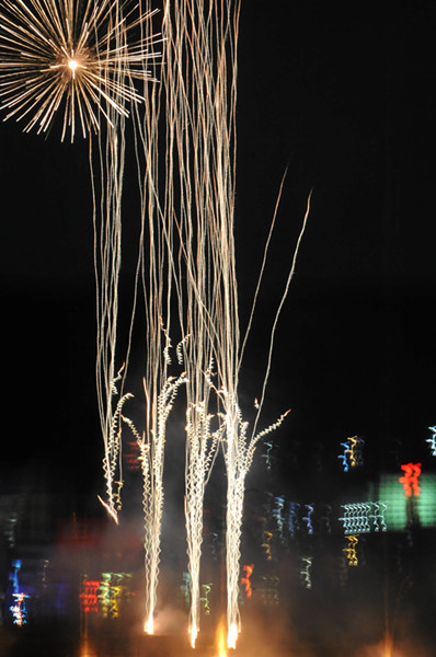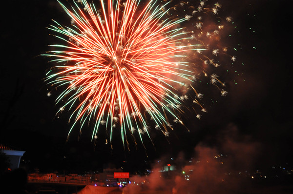 晚8点整,随着一声喜庆的巨响,顷刻间,春雷响彻朝天夜空,200米“宇宙飞星”掠过长空,飞向嘉陵江河道中央,几十米高的“金龙狂舞”焰火光芒四射,拉开了焰火晚会的滚滚春潮。“朝天区委区政府向全区人民拜年”的彩色字幕格外耀眼,烘托出浓浓的节日气氛。“凌空金菊”“牡丹”、“红菊”、“金椰林”、“银椰林”、“金龙腾飞”等上百种形态各异、色彩缤纷的礼花,以不同花型次第腾空而起。发散而下的烟花,如鸟群飞过,似嫩柳摇曳,像金龙飞舞,如山呼海啸。现场观众看得如醉如痴,人人屏住呼吸等待一个个高潮的到来。城区群众无不被这一幅幅精彩的空中立体图画深深陶醉。