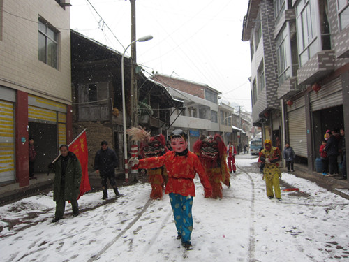 舞狮队和锣鼓队在赵家垭给老百姓拜年
