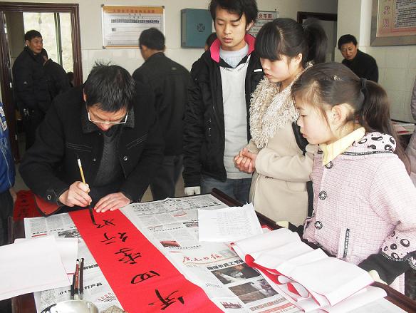 活动现场喜气洋洋,热闹非凡,村民来了一批又一批,营造出了一番浓浓过节气息。村民的积极性也带动了现场三位老师的热情,他们针对不同群众的需求,创作出了一幅幅内容丰富、寓意吉祥的春联。