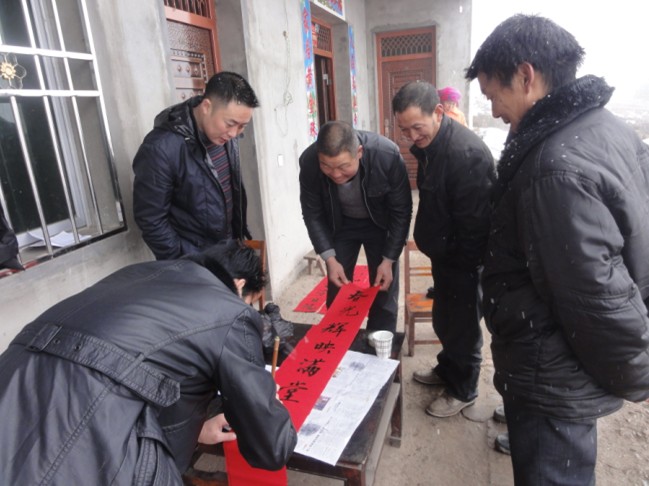 雪花飞舞,天寒地冻。在光明村四组集中安置点,当群众得知书法爱好者要来免费书写春联的消息后,不少村民冒着风雪赶到活动现场等候,不到1个小时,50余幅饱含墨迹充满喜庆的春联,被群众一“抢”而空。“金叶铺满幸福路,勤劳铸就丰收年”、“玉兔呈祥辞旧岁,金龙献瑞迎新春”、“福气降临全家福,春光辉映满堂春”……红红的春联、浓浓的墨香、一句句祝福的话语,寄托着人们对即将到来的农历新年的憧憬和向往。村民刘成安拿着2幅对联很快就贴到房门上,“这比买的对联好多了,那都是印刷体,千篇一律,没这种手写的好看。”