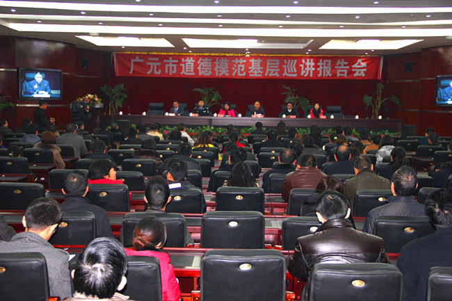 报告会上,全国第一、二届道德模范提名奖获得者罗玮,感动广元人物代表、旺苍县公安局黄洋派出所民警高攀,见义勇为模范、青川县姚渡小学群体代表强通华,敬业奉献模范、利州区工农镇亮垭村党支部书记、主任赵合兴,原朝天区大滩镇高峰村村主任邱子文(广元晚报记者罗真煜代讲)。道德模范用言行,甚至生命诠释的人生价值,深深感染了在座的聆听者,台下时时报以热烈的掌声。