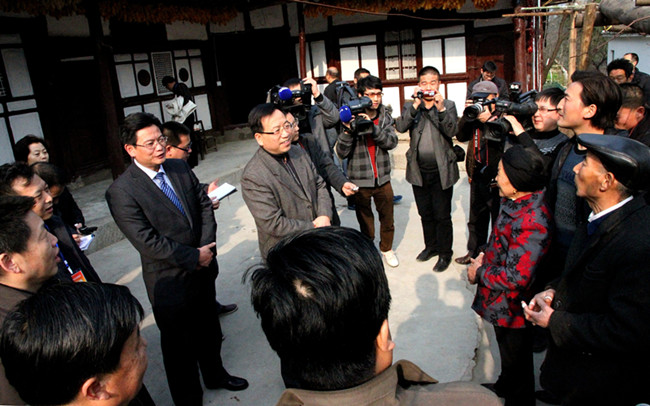 在核桃种植大户张厚乾的房前,代表们遇到了农闲在家休息的张厚乾 。