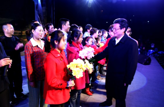 本网讯:11月22日晚,大型豫剧《娘》在朝天区朝天镇第二小学操场上演。区委书记蔡邦银,区委副书记、代区长伏玉琼等四大班子在家领导,区“两会”代表及委员,机关干部及群众2000余人观看了演出。