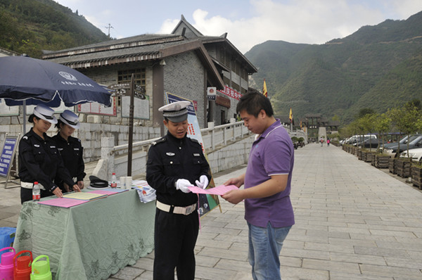 以景区服务为重点,做好“情系游客”工作。大队分别在明月峡景区、马家梁、城区转盘路以及曾家山川洞庵景区设立4个景区服务执勤点,为来朝游客指引道路,发放宣传资料,并免费提供了开水、药品等便民服务。执勤人员着装统一,警容严整,用语文明,充分展示了朝天交警的良好形象。