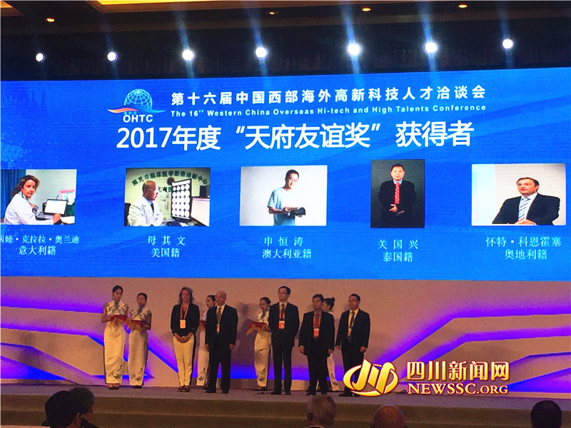 2017年经有关地区、部门推荐,四川省引智专家咨询委员会评审,省政府决定对电子科技大学特聘澳大利亚籍教授申恒涛,川北医学院特聘教授美国籍母其文, 成都大学特聘专家泰国籍关国兴,四川省肿瘤医院特聘意大利籍专家露西娅·克拉拉·奥兰迪尼,绵阳新晨动力机械有限公司特聘奥地利籍宝马公司专家怀特·科恩霍塞授予天府友谊奖。