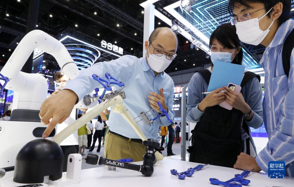 在上海世博中心举办的2022世界人工智能大会上,工作人员(左一)向参观者介绍微创骨科手术机器人(2022年9月1日摄)。新华社记者 方喆 摄