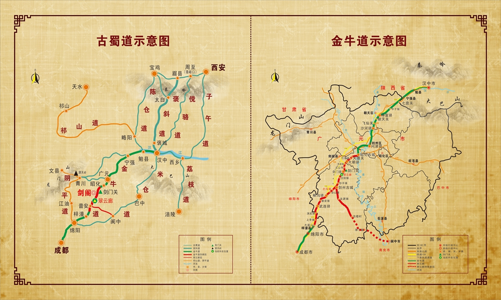 这是翠云廊现场展示的古蜀道和金牛道示意图。