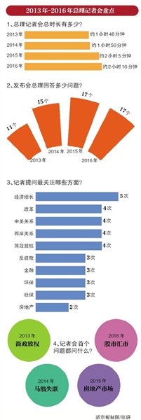 总理记者会历来是每年两会的“压轴大戏”,在之前的四次记者会上,李克强共回答了60个问题,内容多涉及经济、外交、民生等领域,以及上一年发生的热点事件。 新京报记者梳理发现,前4次总理记者会中,经济增长、改革、简政放权、中美关系等问题出现的频率颇高,几乎是每年的必答题。