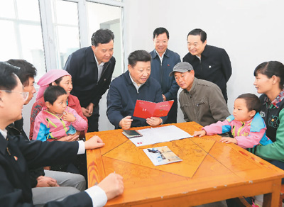 2016年8月23日上午,习近平在青海省海东市互助土族自治县五十镇班彦村村民吕有金家察看《扶贫手册》,了解扶贫措施落实情况。 新华社记者 兰红光摄 |
