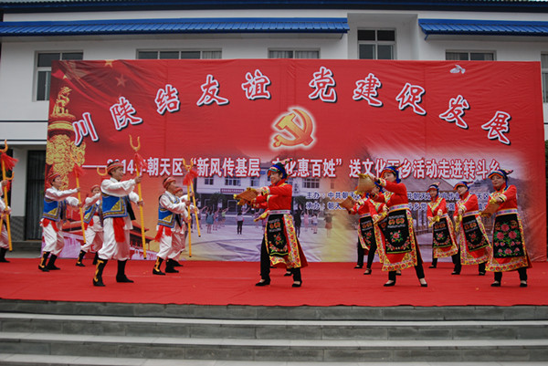 11月14日,由区委组织部、区委宣传部、区文广新局主办,区文化馆、转斗乡党委政府、宁强县汉源镇党委政府承办的“川陕结友谊 党建促发展”朝天区2014年“新风传基层 文化惠百姓”送文艺下乡活动在转斗乡黎明村隆重举行。