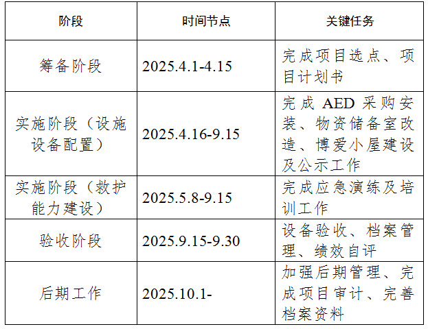 2025年9月底前完成一台AED配置,组织项目点相关人员参加AED正确使用培训,确保相关人员熟练掌握操作技能,为心脏骤停患者的及时抢救提供有力支持。